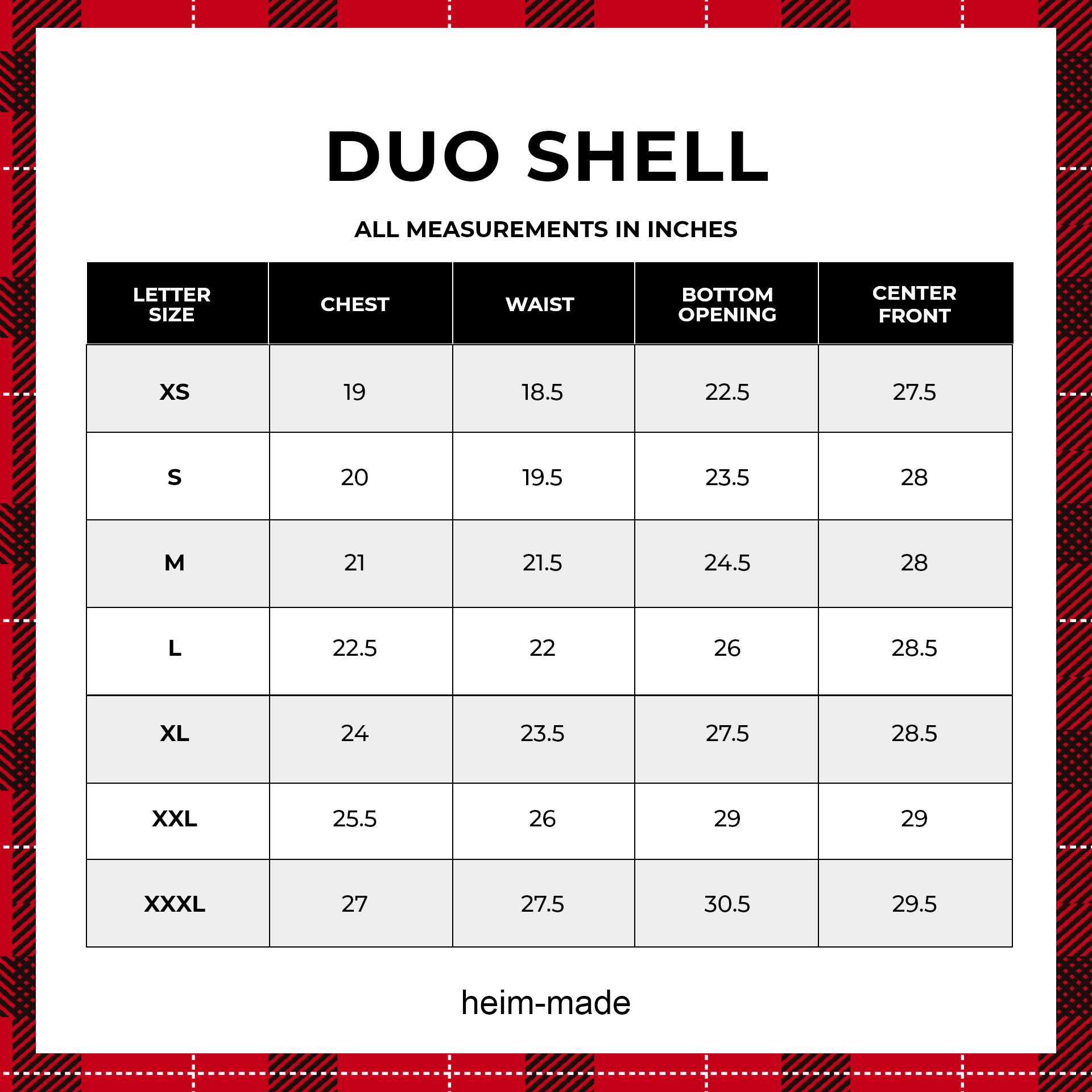Size Guide - DUO All-Weather Shell